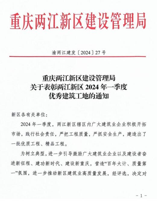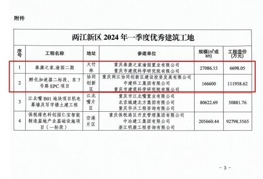 近日,由重慶設計集團市科院公司承擔監理的泰康之家·渝園二期項目以及孵化加速器二標段、東7號路EPC項目在眾多建筑工地中脫穎而出,獲重慶兩江新區建設管理局2024年第一季度優秀建筑工地表彰。