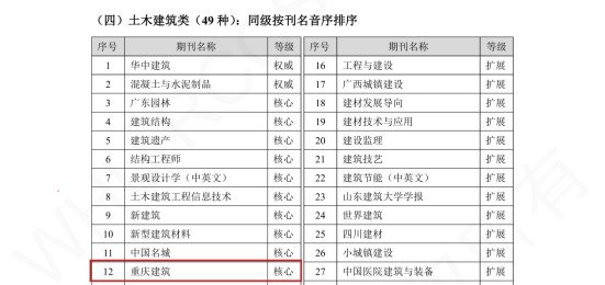 《報告》顯示,首次發(fā)布的評價結(jié)果中,“土木建筑類”應(yīng)用型期刊合計49本,其中2本“權(quán)威”,10本“核心”。《重慶建筑》入選“核心”期刊,按音序排第12位。