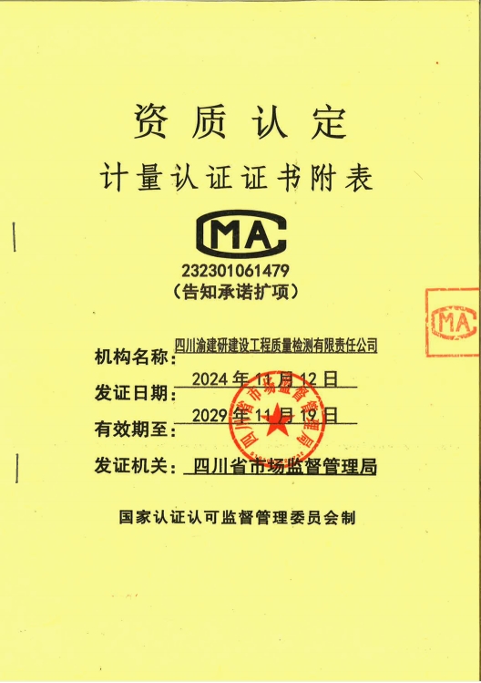 近日,重慶設(shè)計(jì)集團(tuán)市建科院公司所屬子企業(yè)四川渝建研建設(shè)工程質(zhì)量檢測(cè)有限責(zé)任公司(簡(jiǎn)稱“四川渝建研公司”)在檢測(cè)技術(shù)領(lǐng)域取得重大突破,CMA(檢驗(yàn)檢測(cè)機(jī)構(gòu)資質(zhì)認(rèn)定)資質(zhì)參數(shù)由566項(xiàng)成功擴(kuò)增至1132項(xiàng),公司檢測(cè)資質(zhì)范圍由原先的“四大類”增至“八大類”,擴(kuò)項(xiàng)后公司檢測(cè)技術(shù)能力再上新臺(tái)階,滿足了水利工程檢測(cè)資質(zhì)必須參數(shù)需求,位居四川省檢測(cè)機(jī)構(gòu)中上游水平。